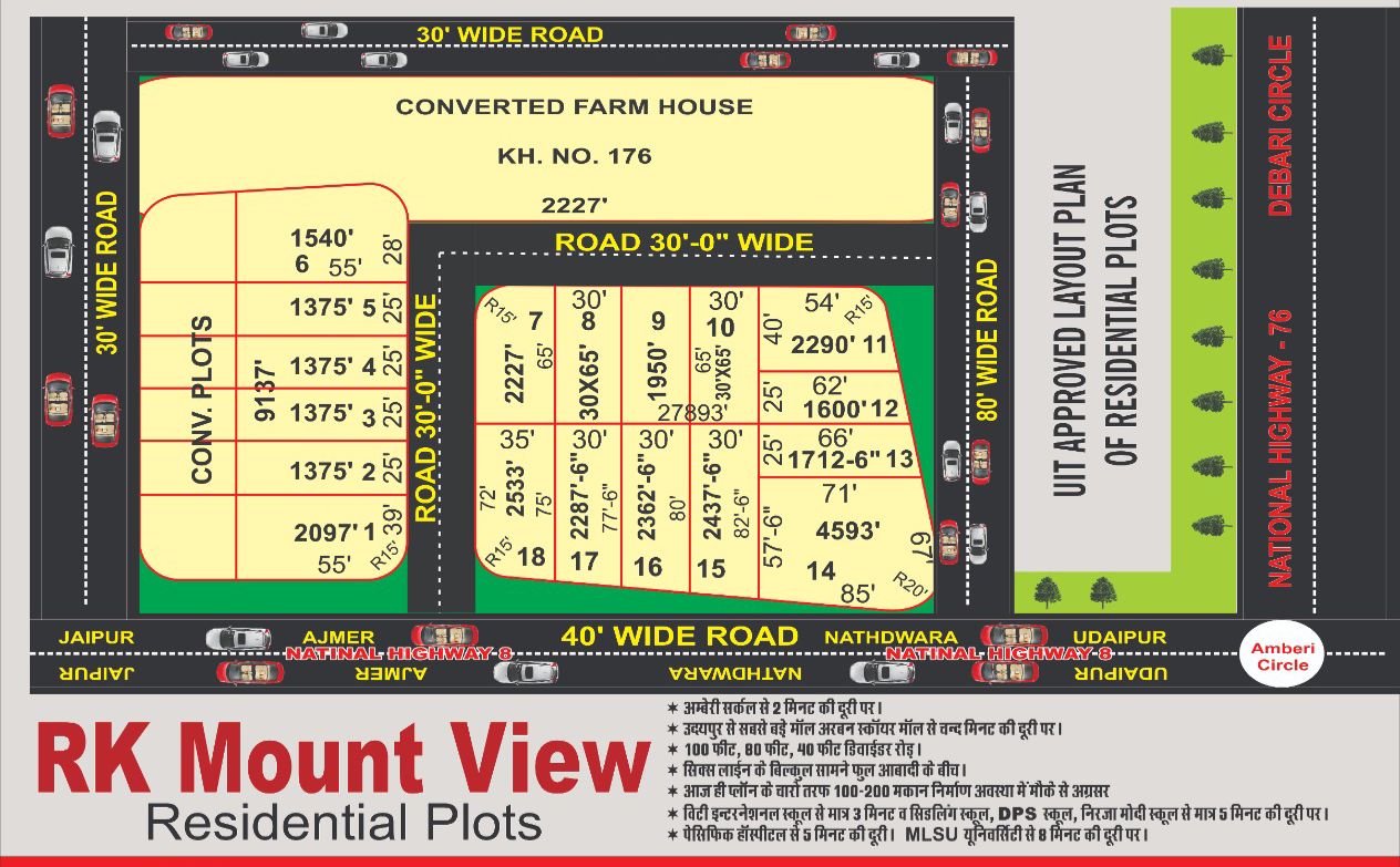 RK Mount View, located on the well-connected 100 Feet Road, Amberi, near Purohit Ji Ka Talab, Udaipur, offers an incredible opportunity to own affordable residential plots in Udaipur. With UDA-approved plots and prime infrastructure, this project is perfect for building your dream home or making a smart investment.